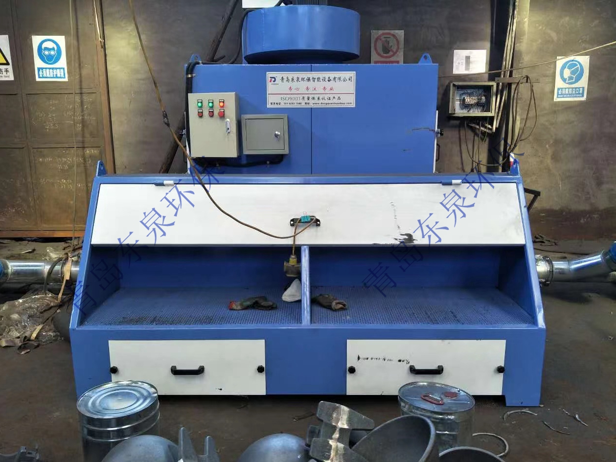 本設備在風機的作用下,含塵氣體從除塵器正面的迷宮式進風窗進入除塵器箱體。粉塵通過迷宮窗慣性碰撞除塵,大顆粒粉塵被碰撞分離,火星被熄滅,粉塵進入第二級濾筒高 效過濾段,含塵氣體由濾筒外表面穿過濾芯,粉塵則被濾芯阻攔在其表面,當被阻攔的粉塵在濾芯表面不斷沉積時,當壓差達到設定值時,壓差傳感器發(fā)出指令,通過脈沖噴吹對濾筒進行逐個清灰,使得沉積在濾芯表面上的粉塵顆粒在壓縮空氣的沖擊下,脫離濾芯表面落入集塵抽屜中,使得整個濾芯表面都得到清潔,凈化后的空氣經(jīng)風機排出。