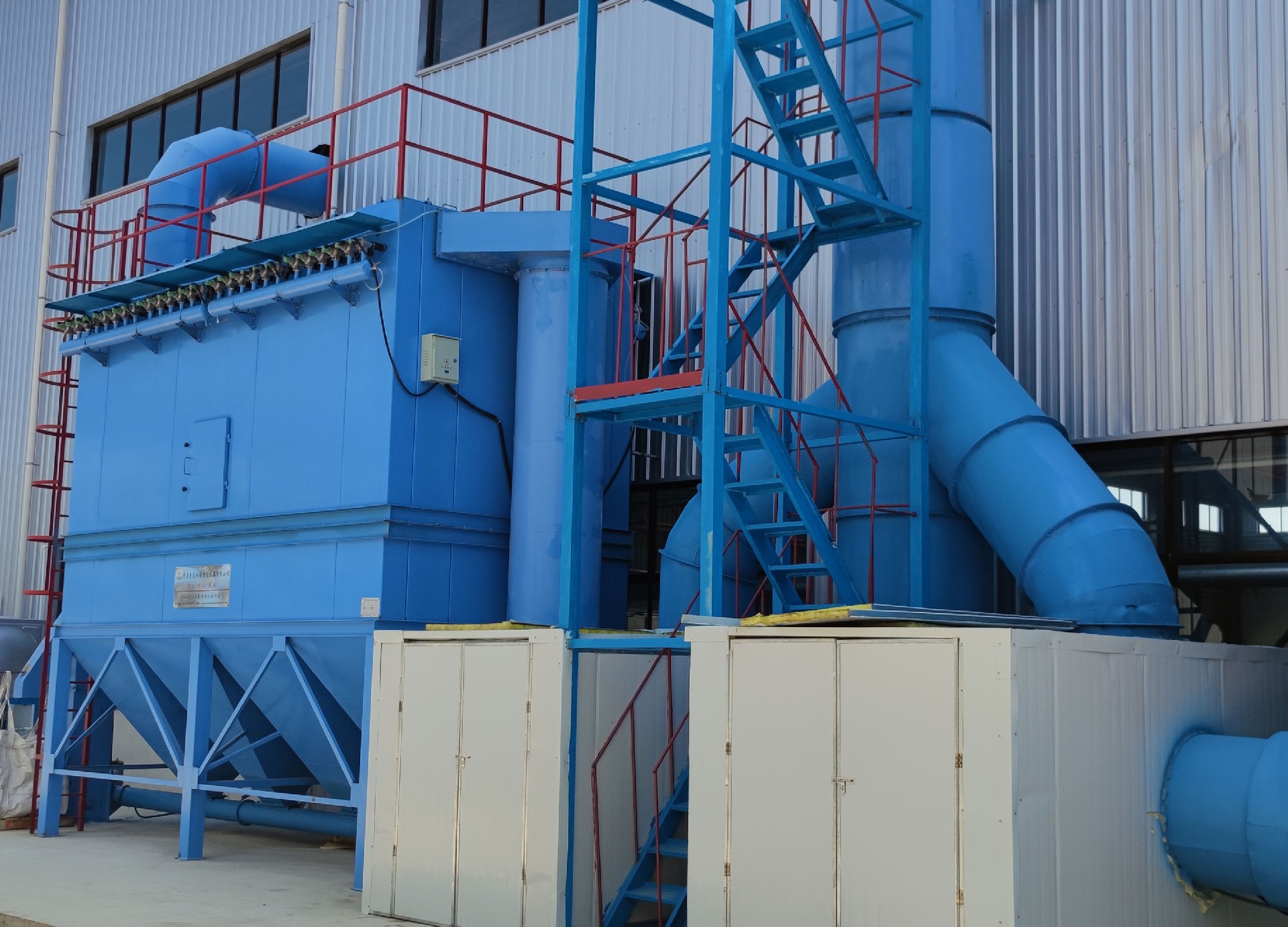 電爐除塵器裝置系統(tǒng)為:將來自工業(yè)硅生產(chǎn)電爐的煙氣,在離心式主風(fēng)機(jī)的抽吸作用下,煙氣由半封閉式電爐內(nèi)引出,沿著煙道首先進(jìn)入旋風(fēng)除塵器。把粗粒、火星分離出來,使其沉降于灰斗至卸料器排出。在有旋風(fēng)除塵器的出口排出,超細(xì)粉塵及含塵氣體進(jìn)入一個(gè)熱交換器,風(fēng)冷降低煙氣溫度,然后其它塵粒隨氣流上升進(jìn)入布袋除塵器各個(gè)袋室。經(jīng)濾袋過濾后,粉塵被阻留在濾袋外面,凈化后的氣體由濾袋進(jìn)入箱體,再通過袋口和上箱體(凈氣室)出風(fēng)口進(jìn)入離心式主風(fēng)機(jī)在排入煙囪至大氣。灰斗中的粉塵定時(shí)或連續(xù)由卸灰系統(tǒng)排出。
