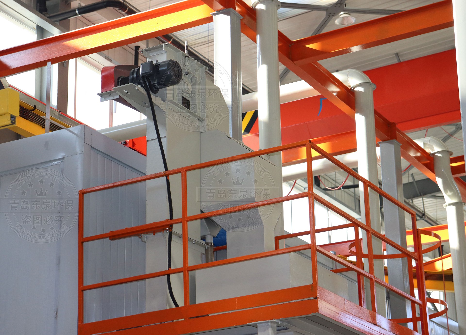 5)采用型鋼做室體框架,外面覆蓋50mm厚彩鋼夾芯板。室體內(nèi)部滿鋪1.5mm鋼板,減少鋼丸沖擊及損壞;內(nèi)襯3mm耐磨橡膠板,防止丸料對板壁的沖擊磨損,噴砂室兩端開門。在噴砂室體兩側各配置1個工作安全門,便于操作人員調整噴砂主機和對設備進行檢修及出現(xiàn)故障時安全撤離。在噴砂室側壁和大門上配置透明觀察窗。